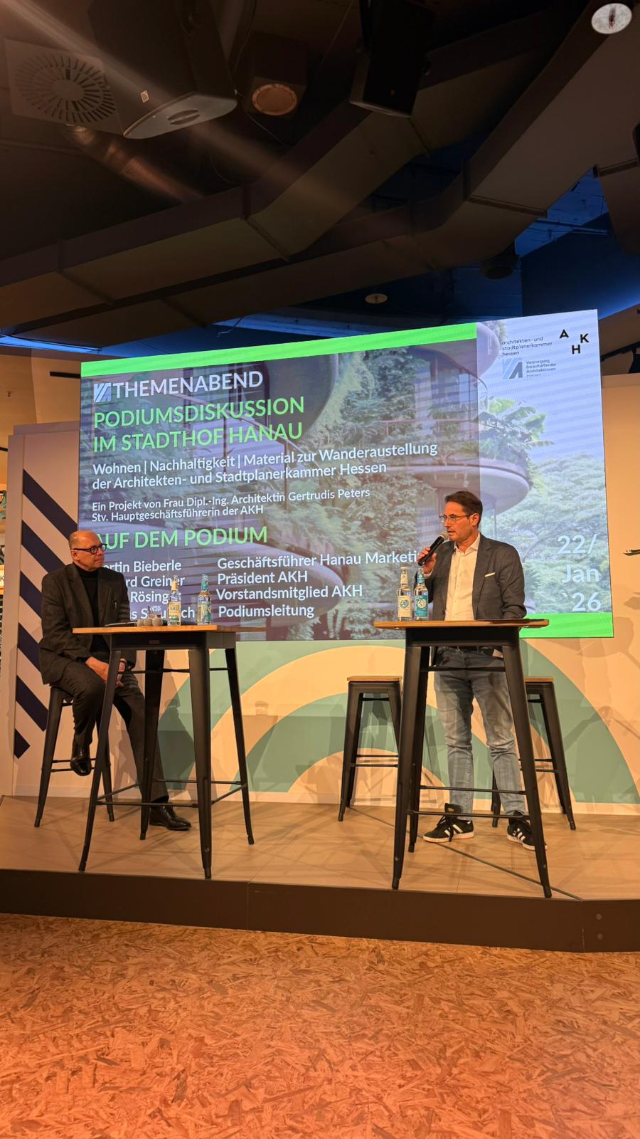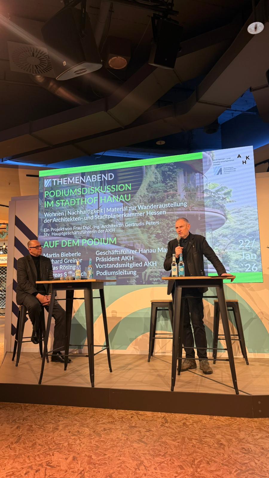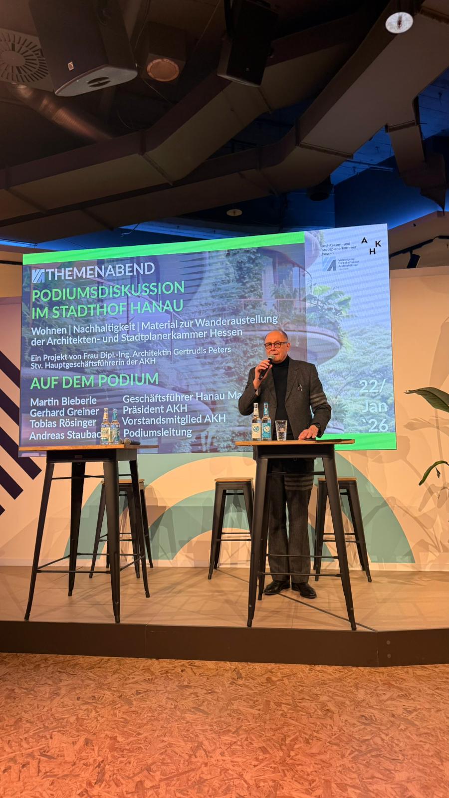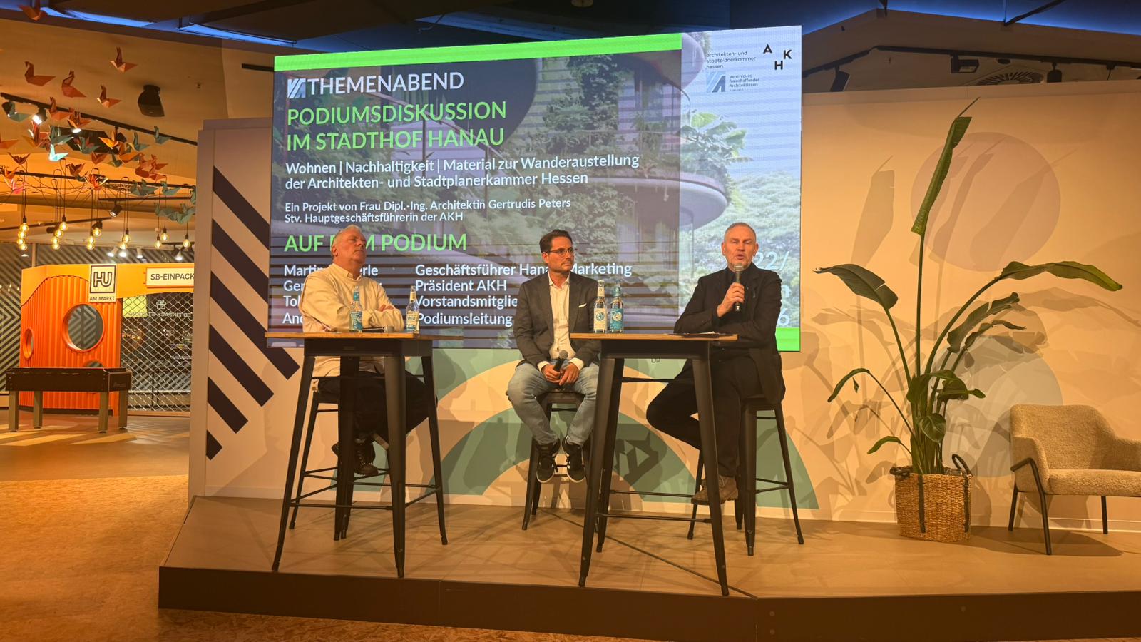 Martin Bieberle berichtete über den Projektverlauf des Stadthofs Hanau, der bundesweit als Vorzeigeprojekt für die nachhaltige Nutzung einer Bestandsimmobilie gilt. Tobias Rösinger gab Einblicke in seine Erfahrungen aus der Entwicklung von Wohnungsbauprojekten in der Metropolregion Frankfurt. Gerhard Greiner beleuchtete schließlich die Rolle der Kammern und den politischen Einfluss auf zentrale Fragestellungen rund um den Wohnungsbau.