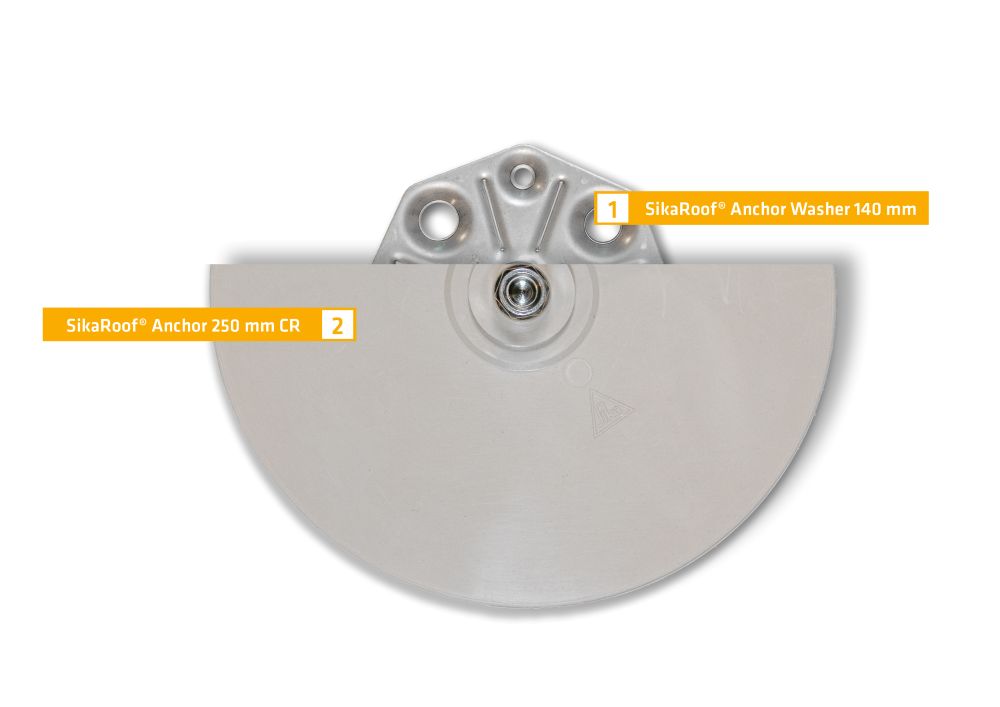 - Das SikaRoof Anchor System, eine universelle Befestigungslösung für Energie- und Gebäudetechnik auf Flachdächern. Es besteht aus dem Metallteller SikaRoof Anchor Washer (1) und dem SikaRoof Anchor aus FPO oder PVC (2). © Sika Deutschland CH AG & Co KG